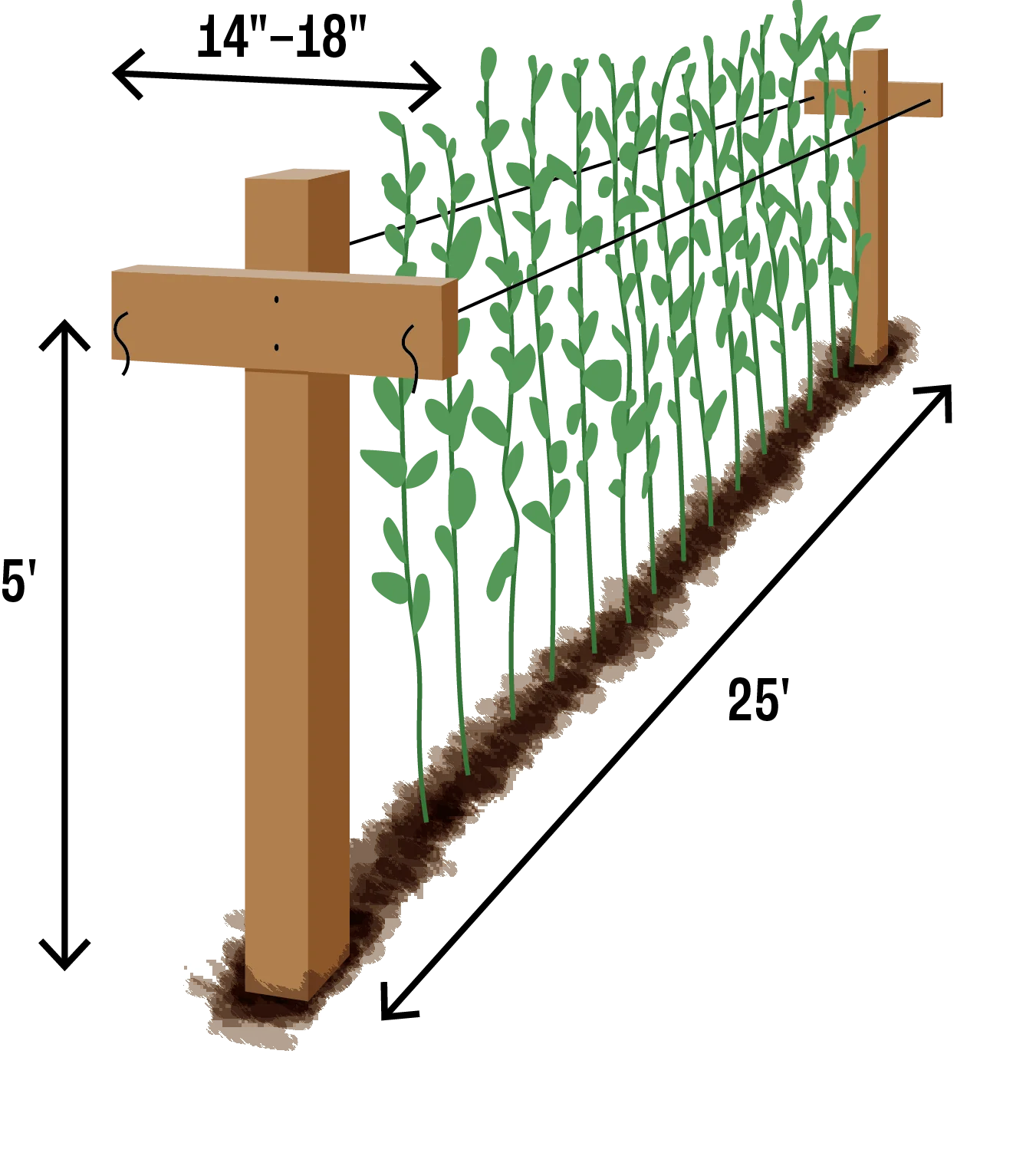 We were successful using a T-trellis which supported two wires 18” apart at 3.5’-5’ above the ground with post every 15’-25’. Our rows were 100’ so we had pressure treated 4” x 4” end posts.