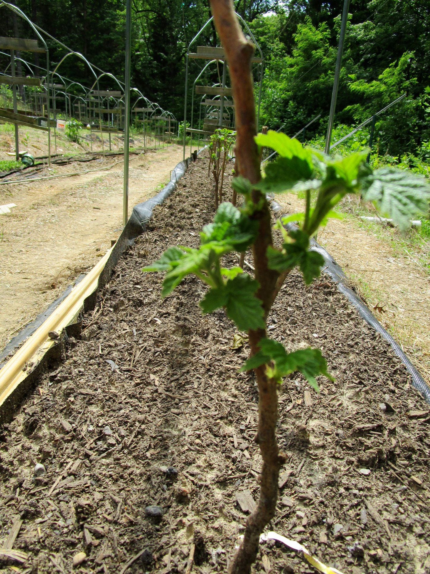 We installed dormant, bare-root raspberry plants. With these you use a hoe to make a two-inch deep trench the length of the bed. Lay the roots horizontally along the trench, two inches (2") deep. You may need to position some canes deeper than two inches (2") so that all roots on the cane are covered, still laying the length of the roots parallel to the soil surface at the two-inch (2") depth. Cover them immediately. If the bare roots are set too deeply, they will not easily send up new canes and potentially die.