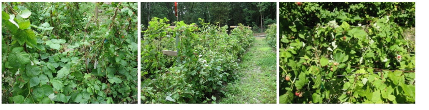 We had floricane berry plants. Floricane bearing red raspberry varieties carry one crop of berries during the summer on over-wintered canes. After harvest, we cut the canes that carried fruit as close to the ground as possible and thinned the remaining new growth to six to eight strong, healthy canes per running foot of row.