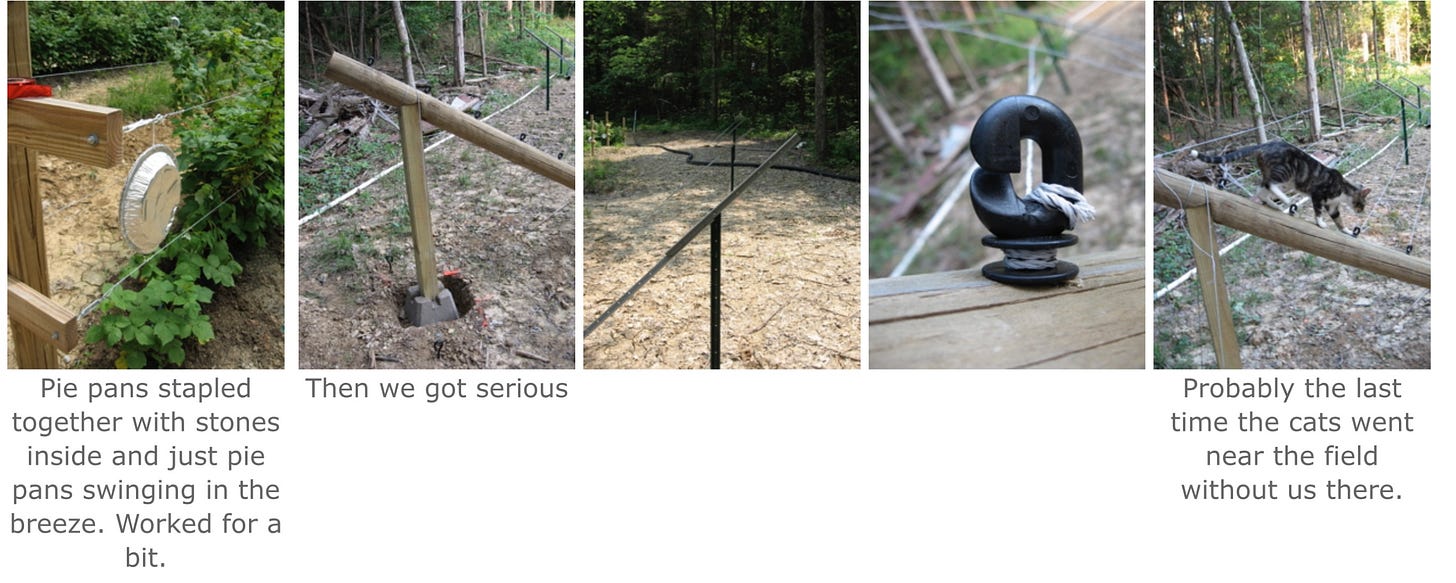 The first time we went to the local feed store owner to ask him for parts we needed, he scratched his head and said "you want to do what?". He really was a good sport and helped us immensely with our crude drawings and almost baked solutions. We built a new twist on the solar powered electric fence. And not one critter foot print in the fields, no deer, no turkeys, not even raccoons after that.